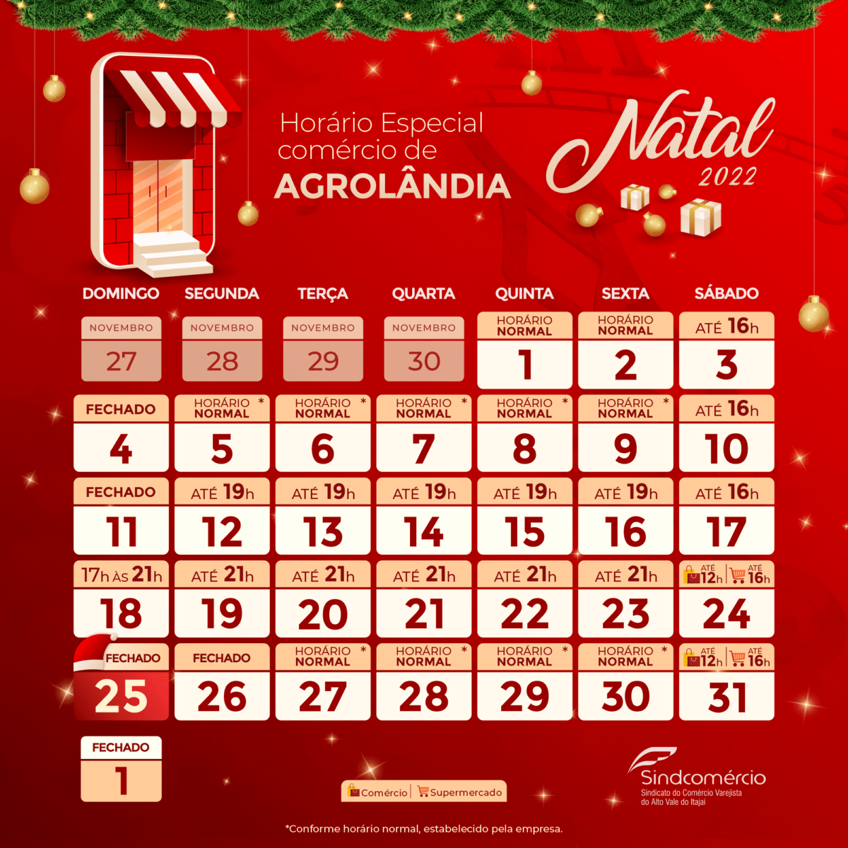 Horário de Natal Agrolândia- SC 2022 26/01/2023 14:26 O Sindicomercio e Sindicato dos empregados firmam documento acerca das informações necessárias para abertura em horário estendido no Período de Natal.